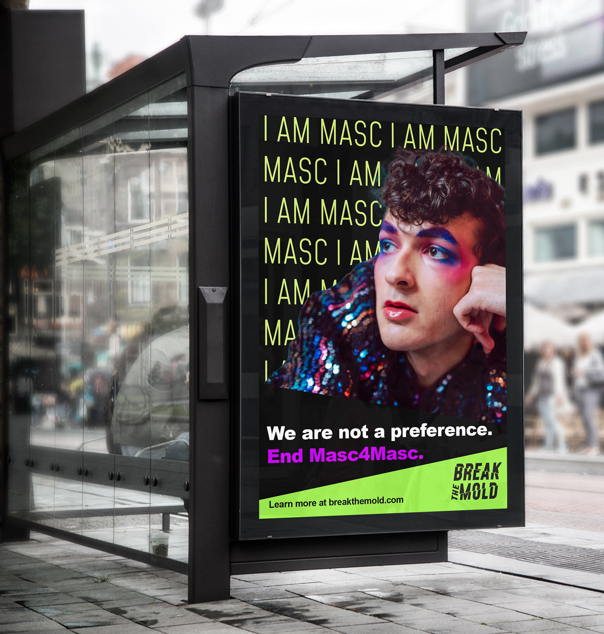 Break the Mold presents the faces of those victimized by Masc4Masc discrimination. The use of bold colors paired with the patterned tag lines "I Am Masc" and "Inclusion for Diversity" draw attention to otherwise filtered-out identities.